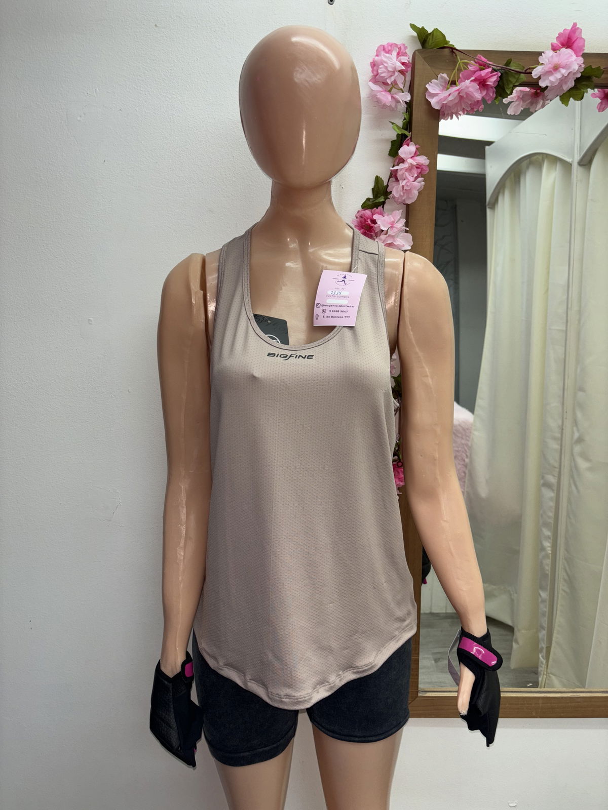 La Musculosa BIGFINE está confeccionada en tela DryFit, diseñada especialmente para evaporar el sudor rápidamente y mantenerte fresca y seca durante todo tu entrenamiento.