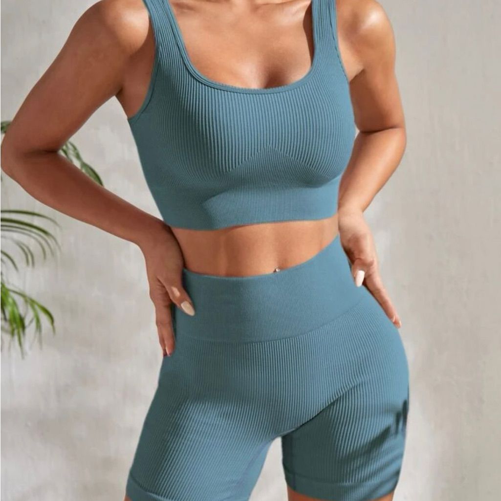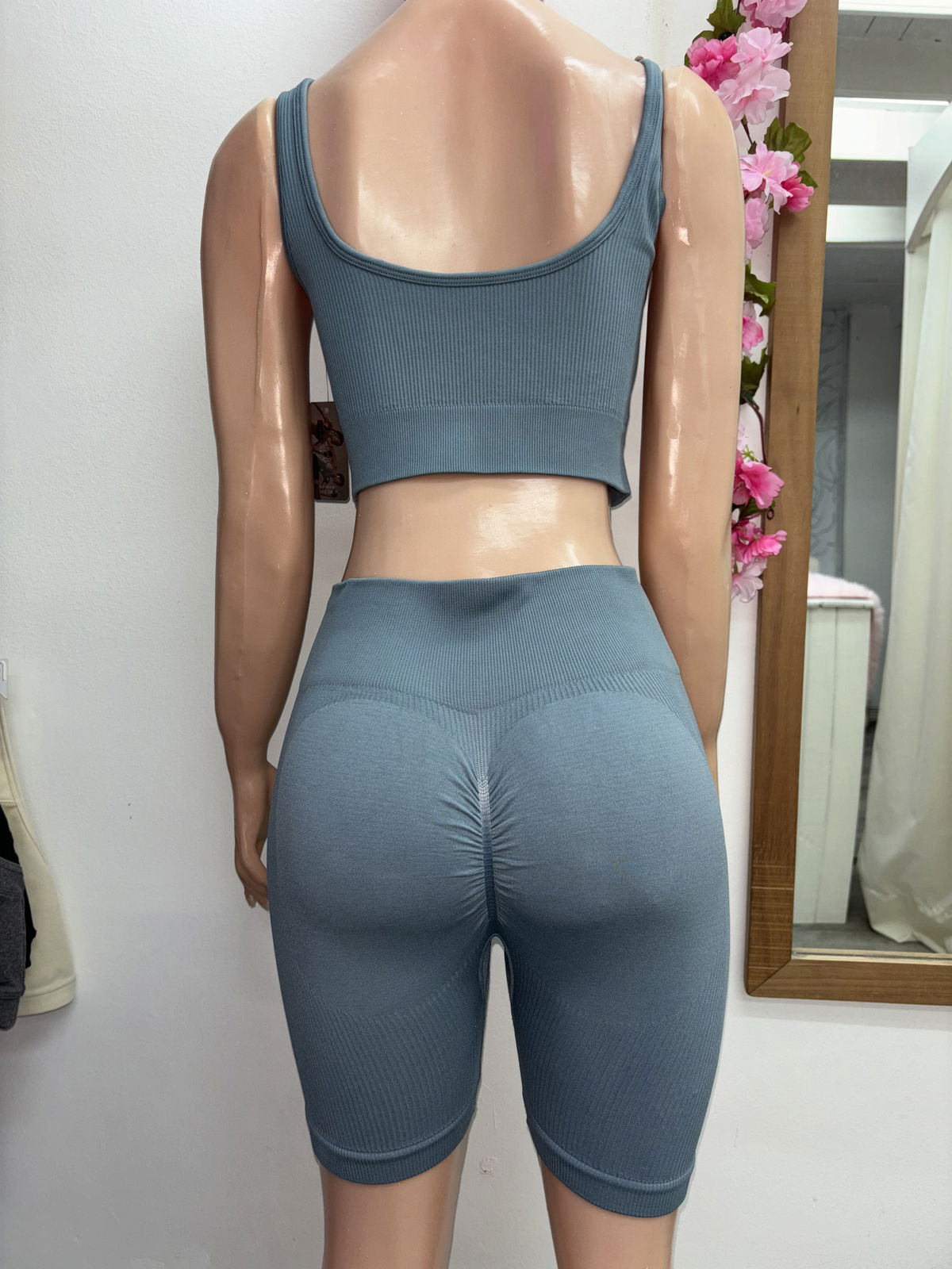 El short con frunce trasero realza tus curvas sin esfuerzo, mientras que el top con tazas desmontables te brinda el soporte justo con opción a usarlo como más te guste 🤍