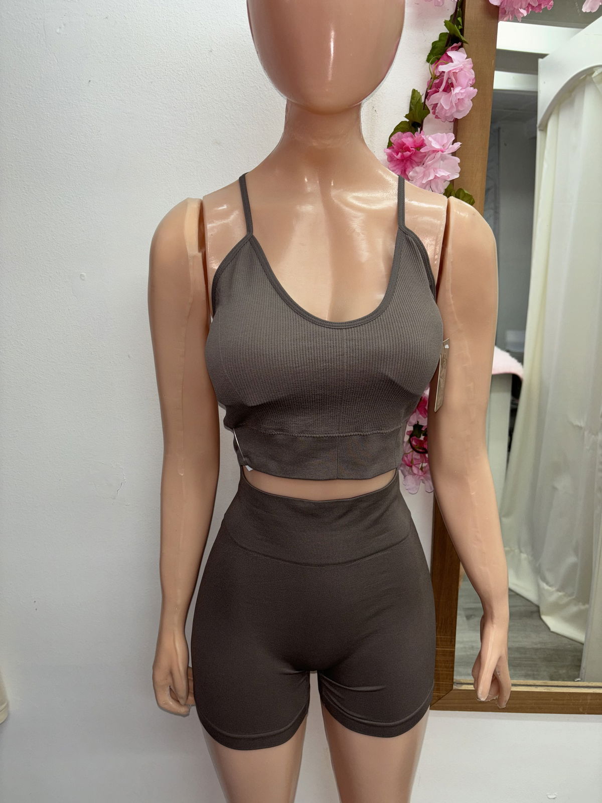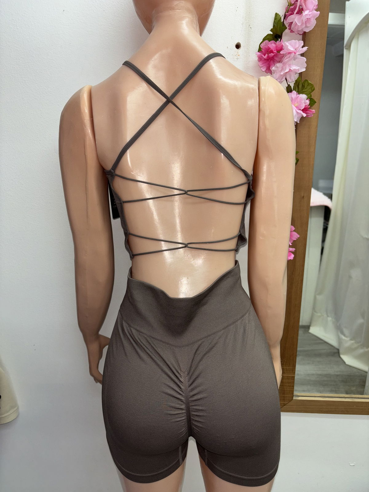Conjunto crop top espalda cruzada + short con frunce | gris topo