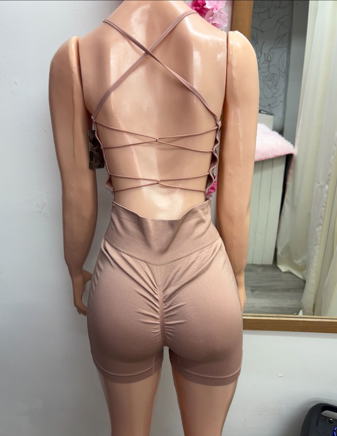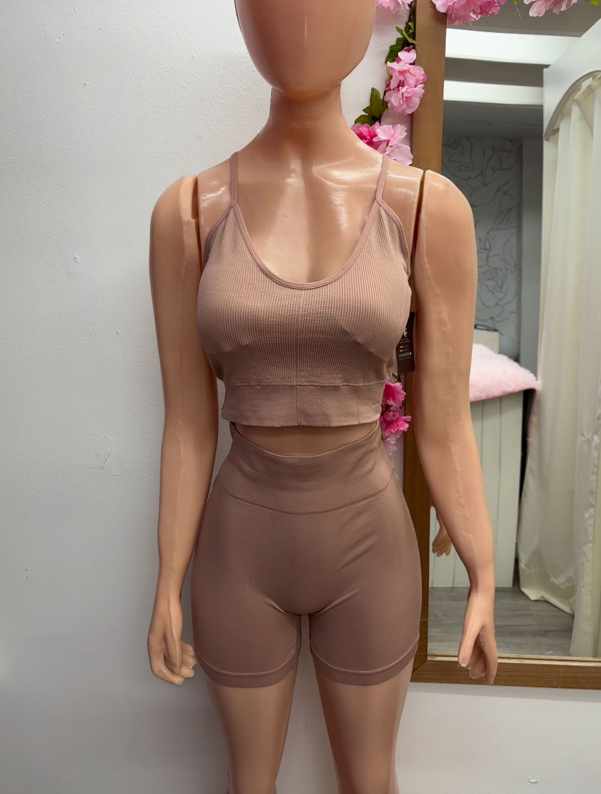 Conjunto crop top espalda cruzada + short con frunce | rosa pálido 🌸