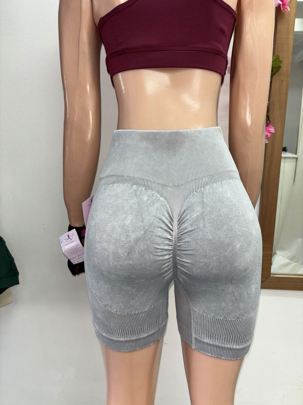 Nuestro short prelavado es perfecto para entrenar con confianza y verte increíble. El frunce trasero 🍑 realza tu figura, mientras que la cintura compresora y el tiro alto te brindan firmeza y soporte en cada movimiento.
