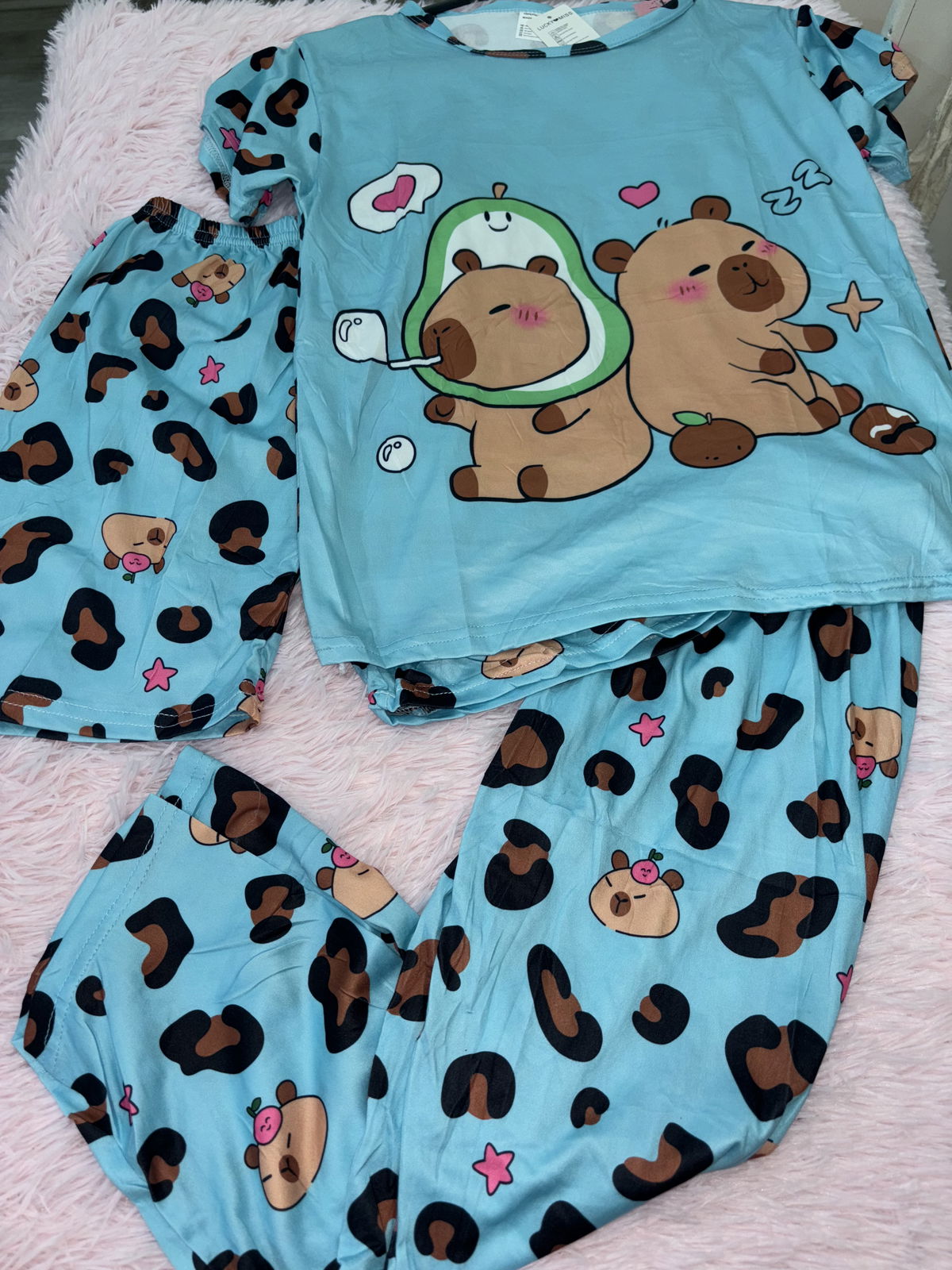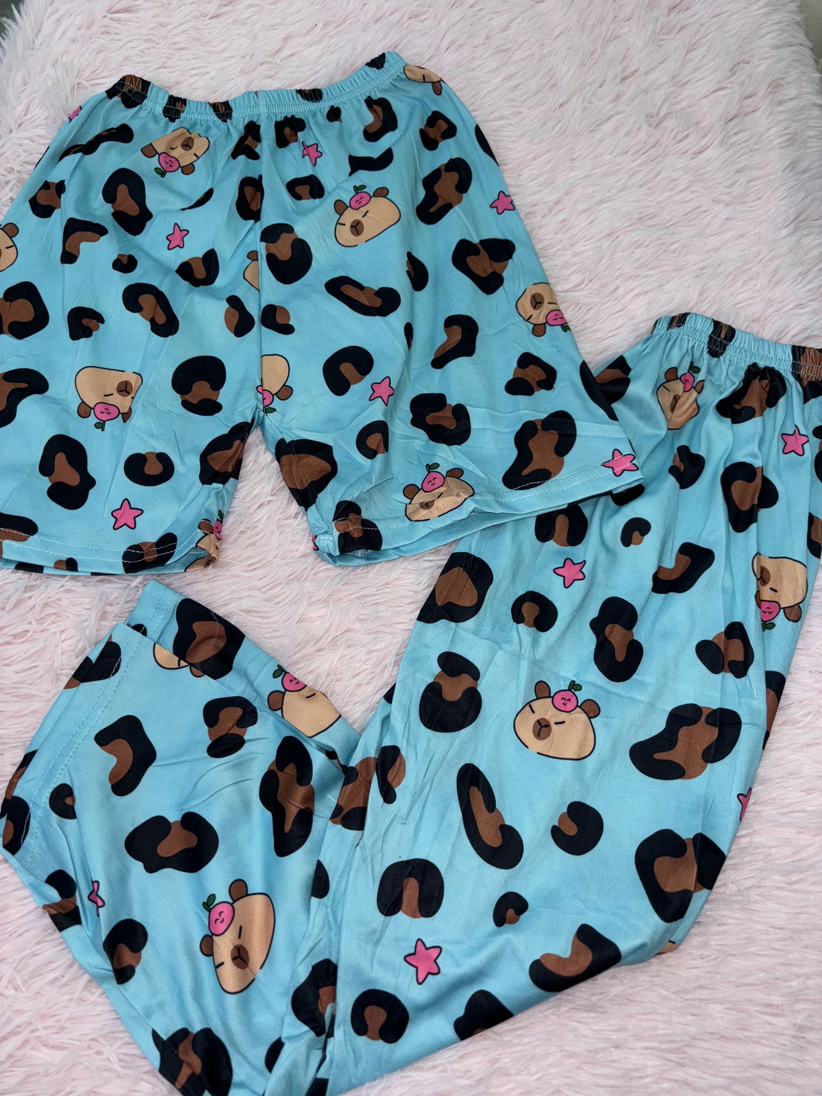 Pijama 3 piezas de niña👧: Remera + short suelto + pantalón liviano | Capibara talle 14
